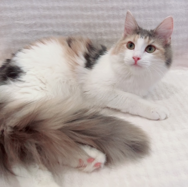 柔らかなキャリコ模様に、ふわふわとボリュームのある尻尾がとても魅力的。